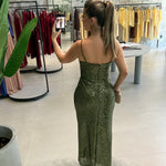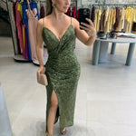 VESTIDO EM PAETÊ/ 92% POLIESTER 8% ELASTANO/ZIPER ATRAS/TEM BOJO/FORRADO/ FENDA FRONTAL